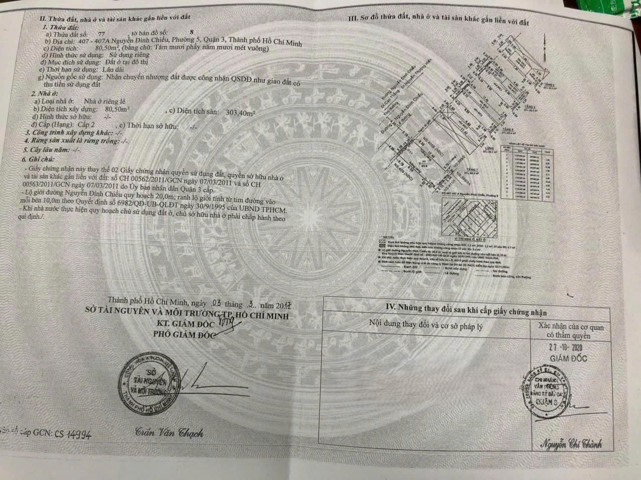 BÁN NHÀ MT SỐ 407-407A NGUYỄN ĐÌNH CHIỂU, PHƯỜNG 5, QUẬN 3, TPHCM